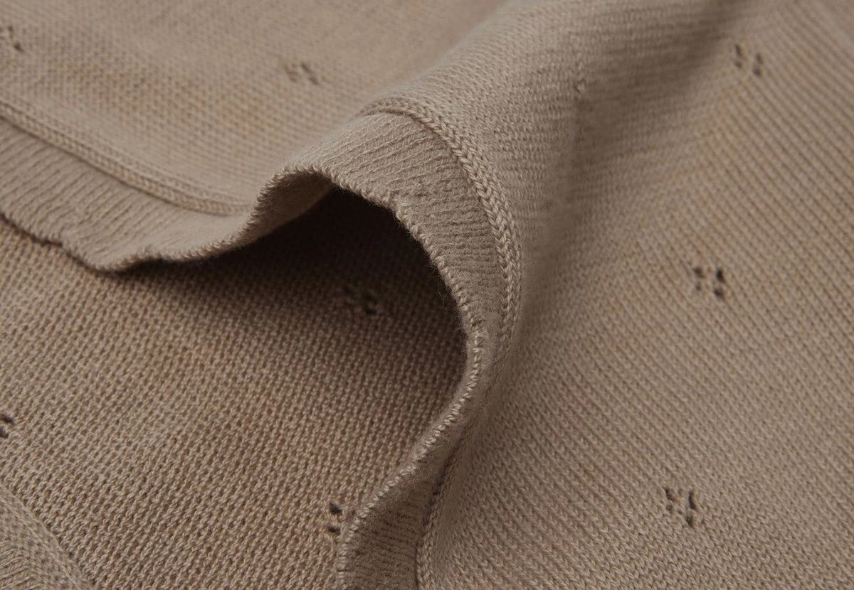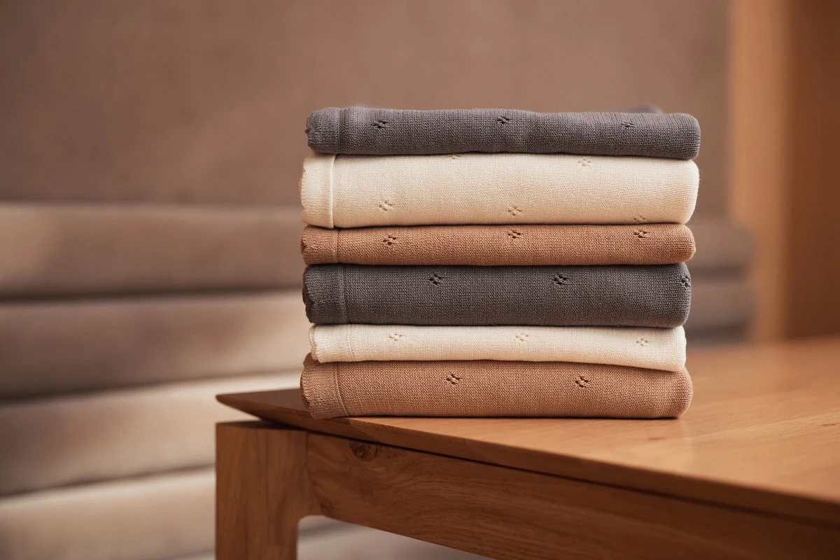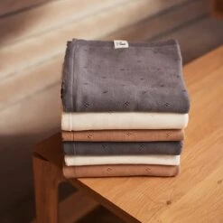 Het Pointelle dekentje shop je in de kleuren ivory, strom grey en biscuit in de formaten 75×100 cm voor de wieg en 100×150 cm in het ledikantje.