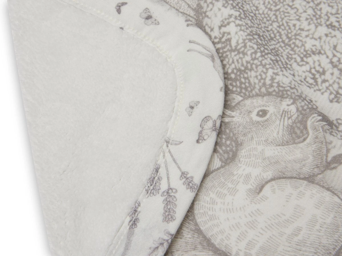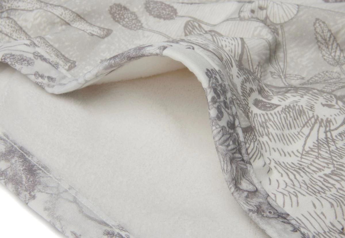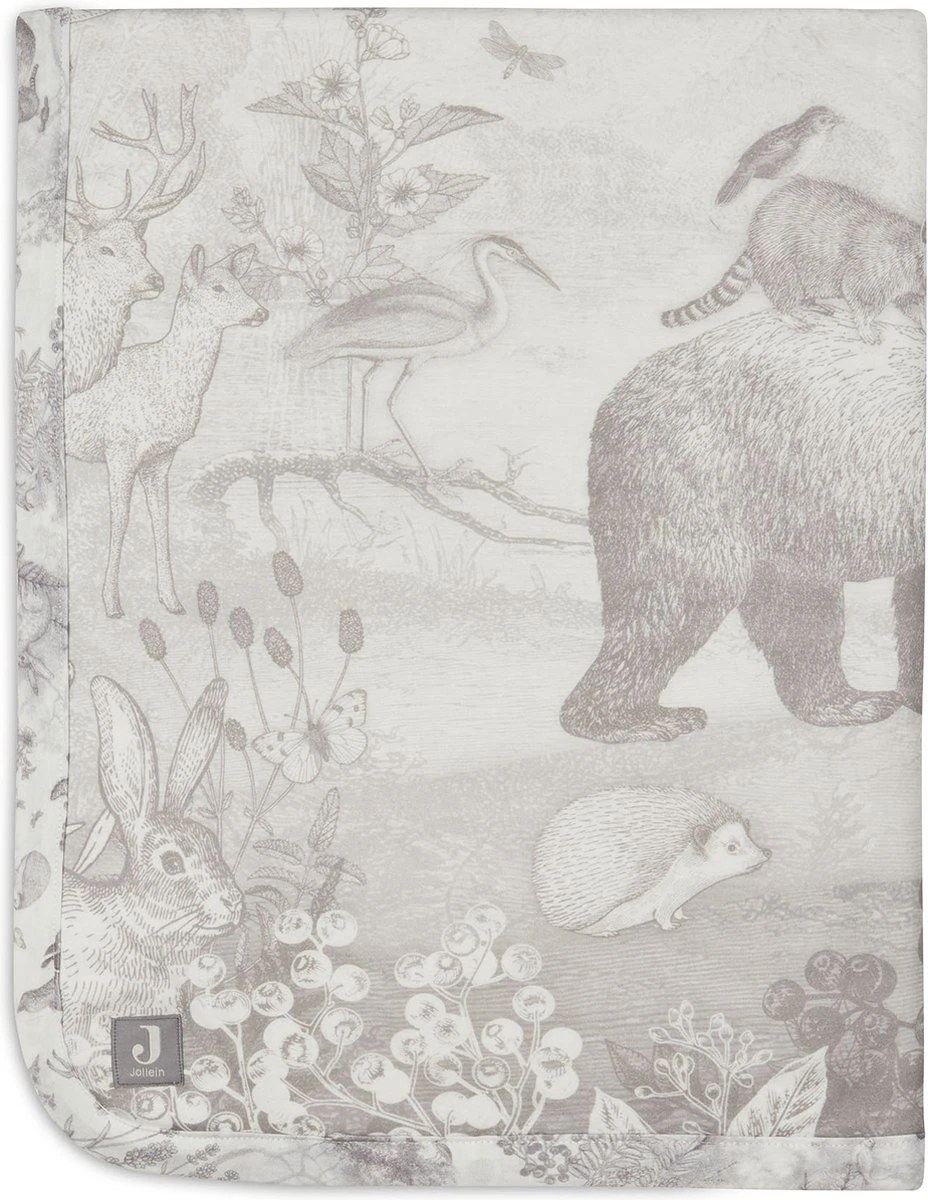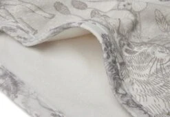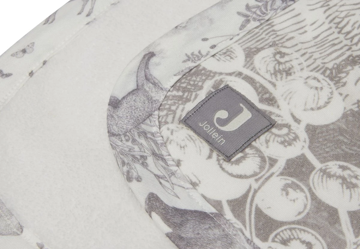 Op elk item zie je het lieve bosdieren printje terug, sommige met een grote panelprint, sommige met een all-over printje. De print heeft een off-white ondergrond met een grijze print.