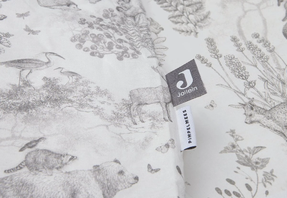Het lakentje is wit met een geprinte boord aan de bovenkant. De boord heeft een lieve bosdierenprint van het Pimpelmees x Jollein thema. De boord sla je om de deken heen ter bescherming en het staat ook nog eens erg leuk.