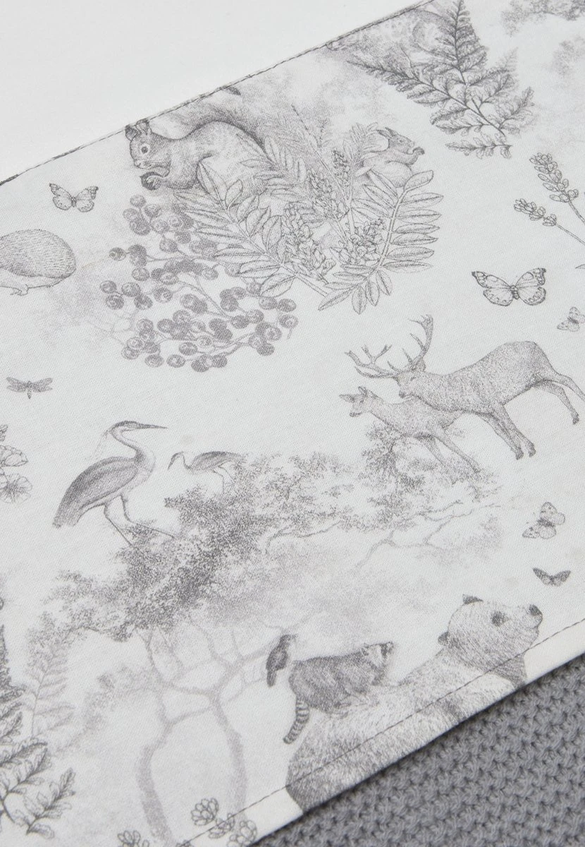 Op elk item zie je het lieve bosdieren printje terug, sommige met een grote panelprint, sommige met een all-over printje. De print heeft een off-white ondergrond met een grijze print.