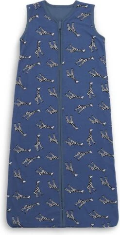 Deze slaapzak is verkrijgbaar in jeansblauw en caramel. Beiden uitgevoerd met een print van zwart witte giraffes.
