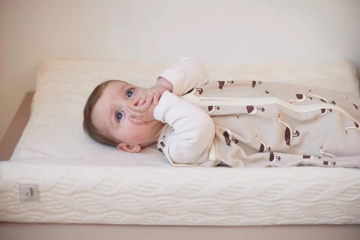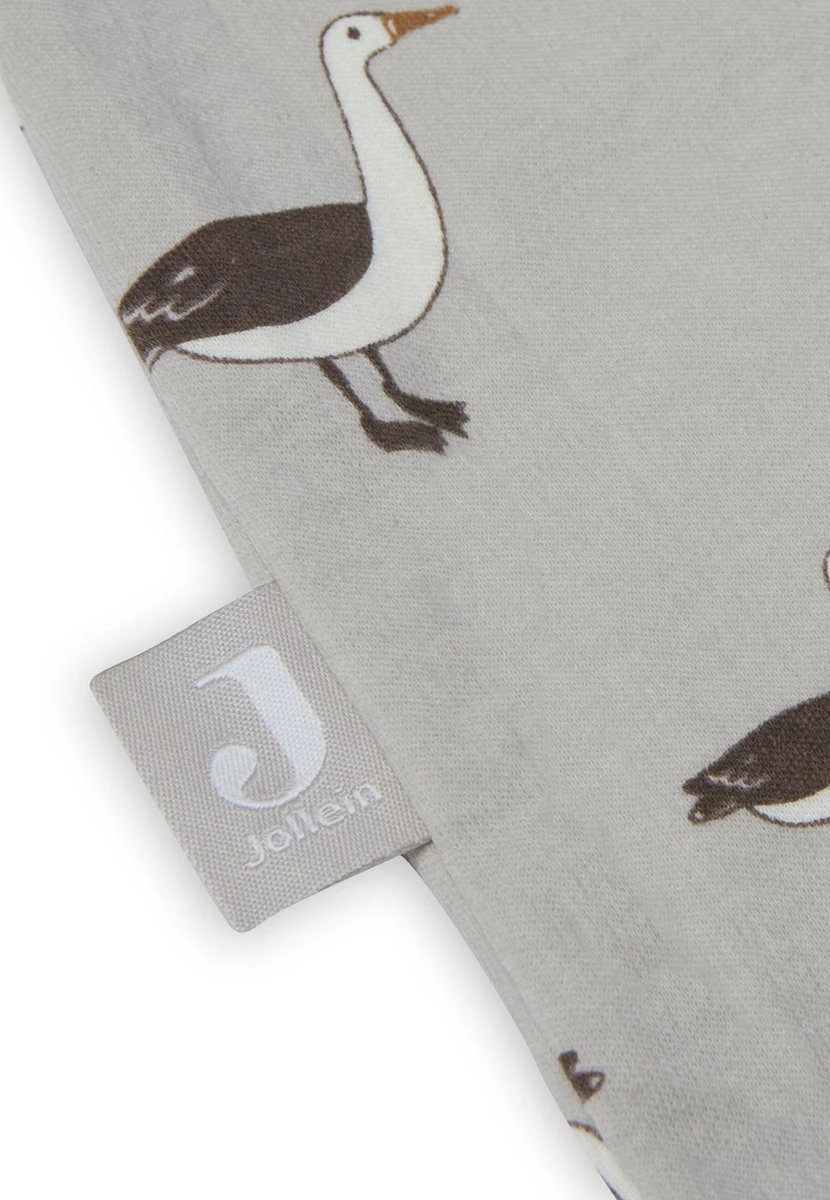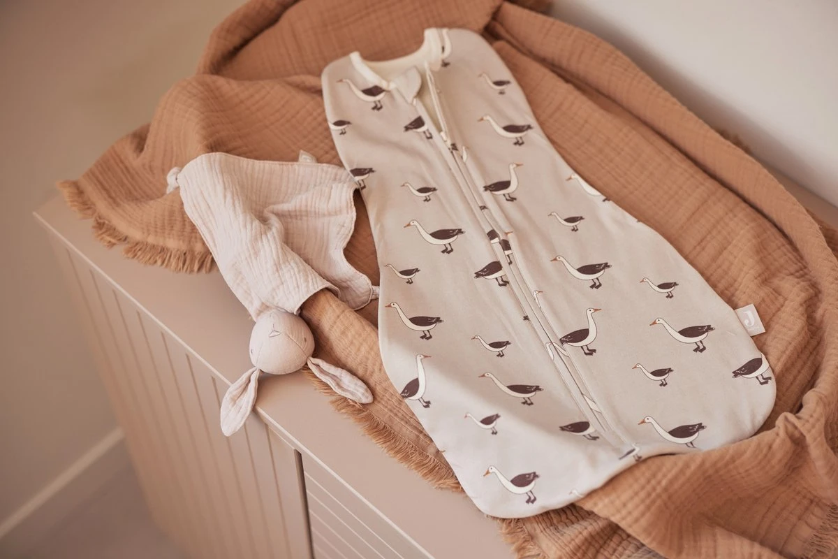 Het Goose thema is vrolijk met zijn schattige witte gansjes op een neutrale achtergrond van nougat of biscuit. In het thema vind je alleen slaapzakjes van heerlijke stretchy jersey met een TOG-waarde van 0.5. Goose is een perfecte match met Pointelle dekentjes van Jollein.