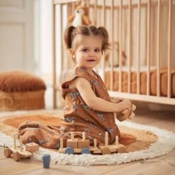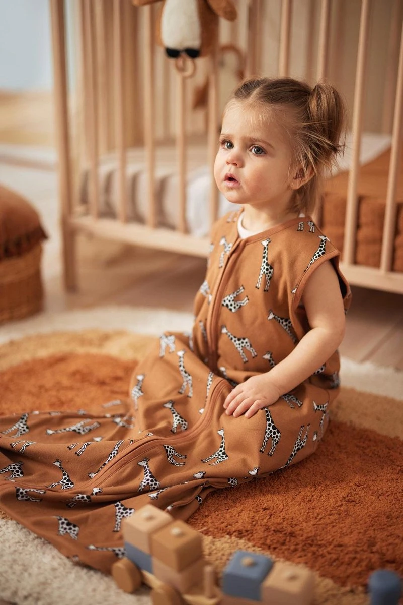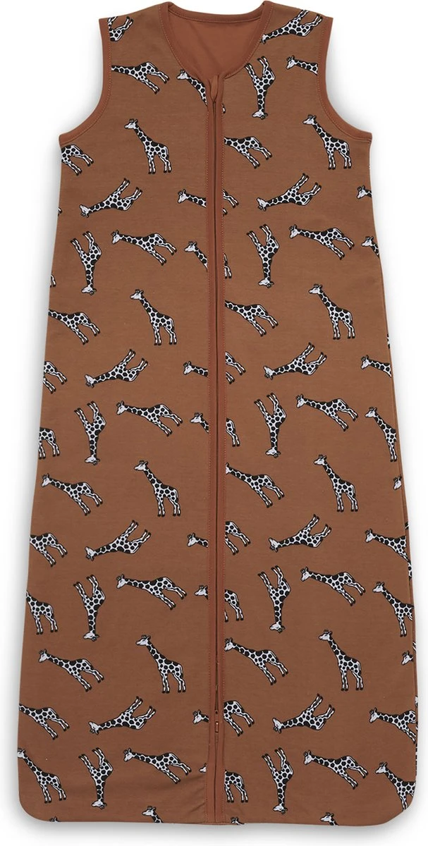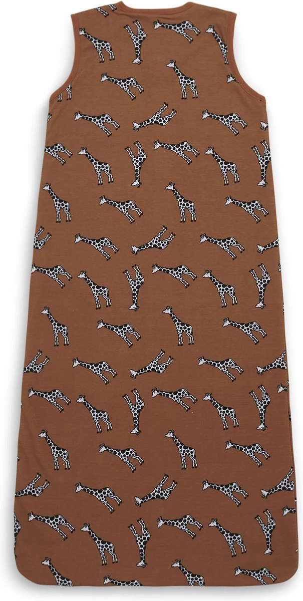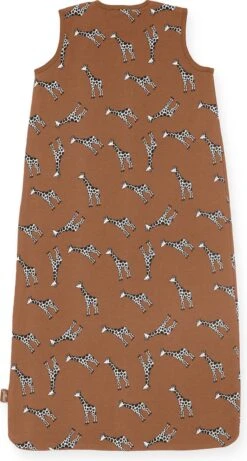 Deze slaapzak is verkrijgbaar in jeansblauw en caramel. Beiden uitgevoerd met een print van zwart witte giraffes.