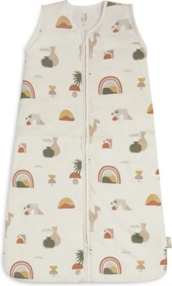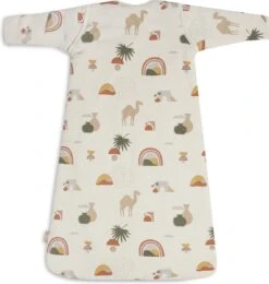 Deze prachtige Middle East print is geïnspireerd op het Midden Oosten. Met het schattige kameeltje, palmboompjes en regenboogje waan je je in de vakantie sferen. Je combineert dit slaapzakje met leuke print met onze Pure Knit dekens.