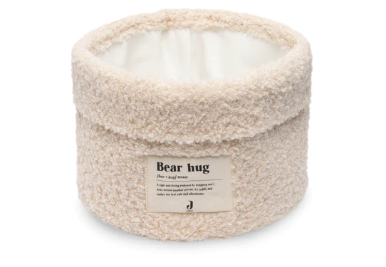 Praktische mand gemaakt van zachte bakstof Bouclé, perfect voor het opbergen van losse spullen. De mand is 14 cm hoog, met een diameter van 18 cm. Op de voorkant van de mand staat het leuke ‘bear-hug’ logo. Deze mand is super praktisch om op de commode te zetten, om kleine verzorgingsspullen zoals een manicureset, een borstel en een thermometer in op te bergen. En tegelijkertijd is het een perfect item om wat sfeer toe te voegen aan de babykamer. Met deze opbergmand houd je de lades van de kaptafel netjes. Een mand voor sokken, voor verzorgingsproducten en voor babyslofjes. Het ziet er ook nog eens heel stijlvol uit op de kaptafel! Het is ook erg praktisch in de woonkamer, voor klein speelgoed. Je kunt deze kaptafelmand ook combineren met de grote opbergmand Bouclé.